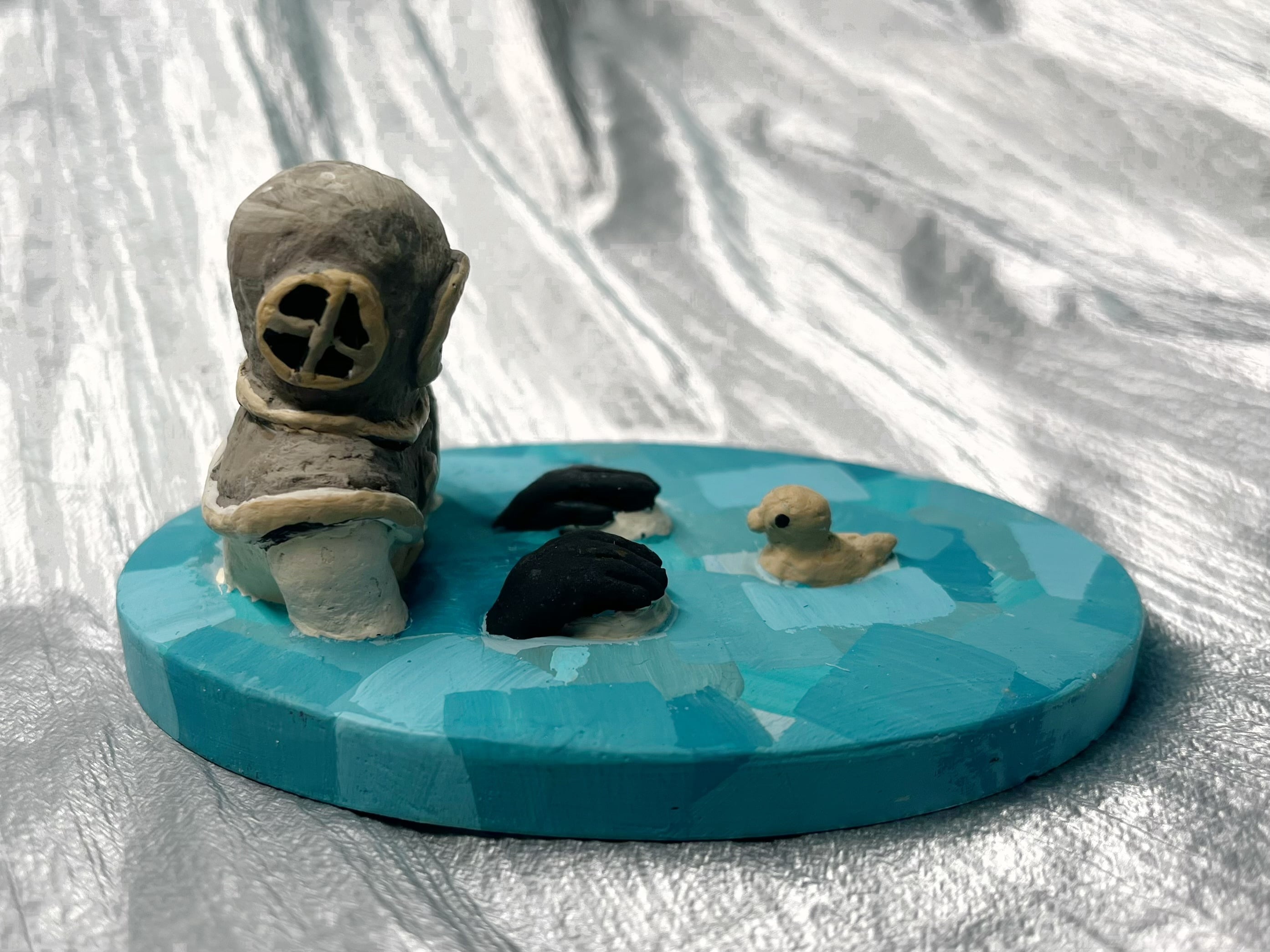 三角座りで身を縮め、重たい潜水ヘルメット越しに何かを語りかけるような、あるいは語りかけられているような。