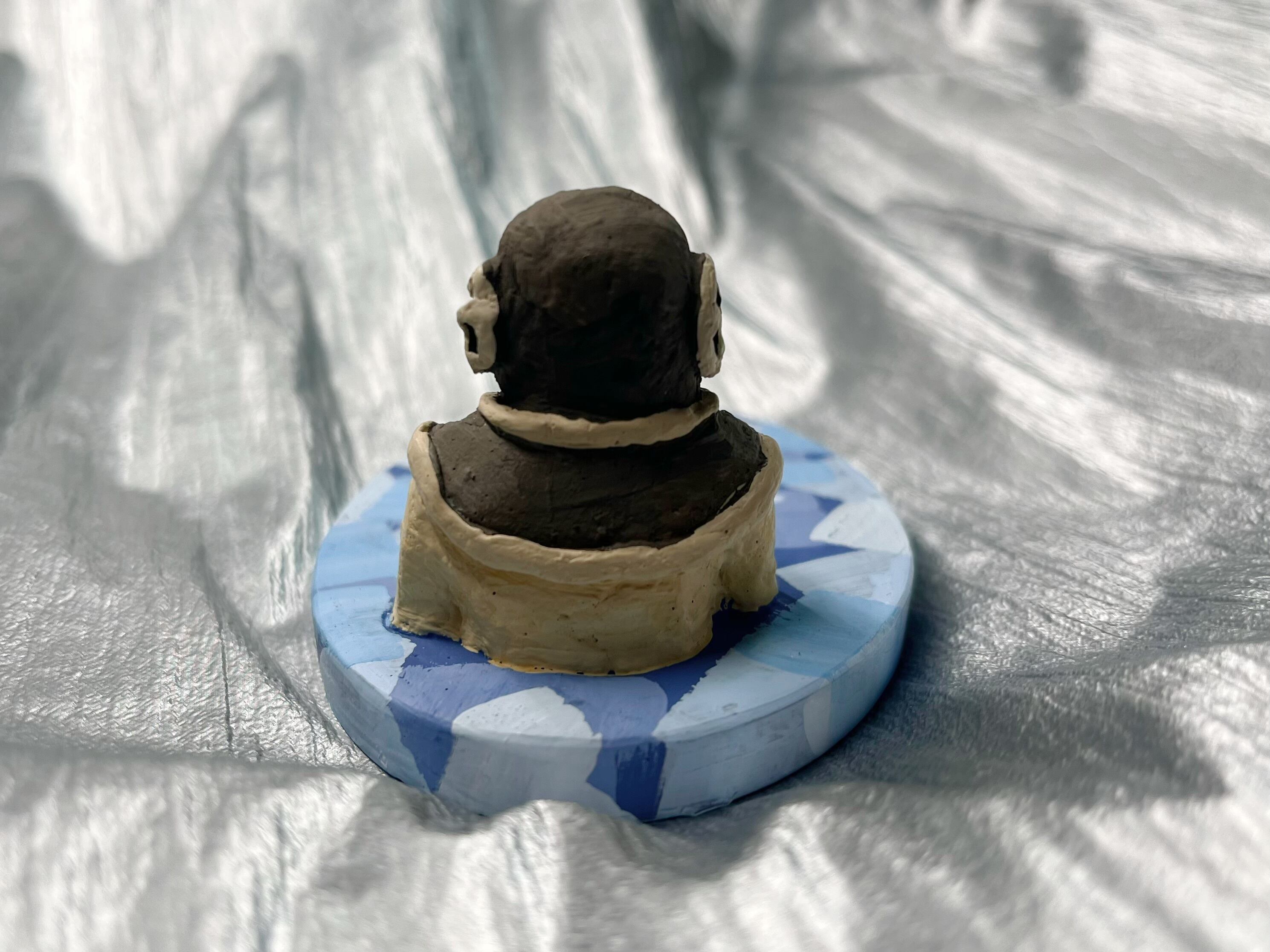 三角座りで身を縮め、重たい潜水ヘルメット越しに何かを語りかけるような、あるいは語りかけられているような。